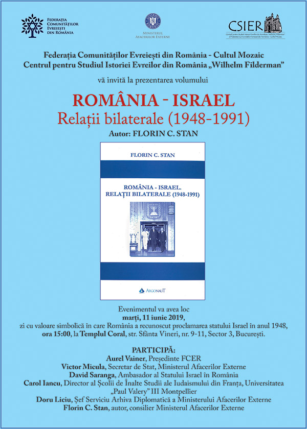AGERPRES despre prezentarea volumului Volumul „România-Israel. Relații bilaterale (1948 – 1991). Volumul „România-Israel. Relații bilaterale (1948 – 1991) lansat de Dr. Florin C. Stan, consilier în cadrul Arhivelor Diplomatice ale MAE, a fost lansat, marți, la Templul Coral