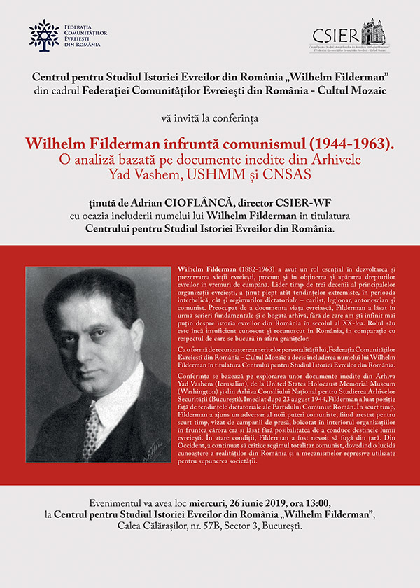 Centrul pentru Studiul Istoriei Evreilor din România (CSIER) din cadrul Federației Comunităților Evreiești din România – Cultul Mozaic (FCER – CM) și-a schimbat titulatura, devenind Centrul pentru Studiul Istoriei Evreilor din România „Wilhelm Filderman”. Schimbarea de titulatură a fost aprobată de Comitetul Director al FCER – CM.