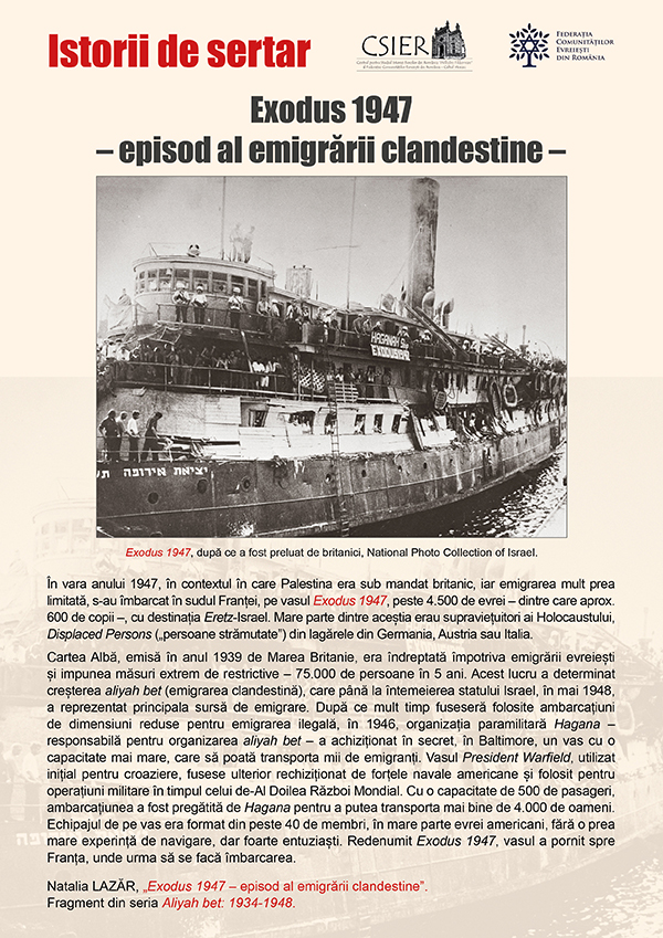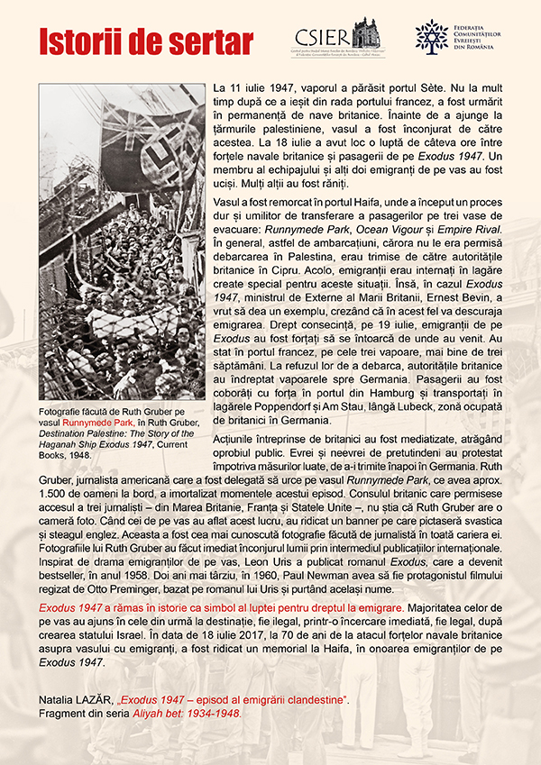 „Exodus 1947- episod al emigrării clandestine” Mai multe imagini realizate de Ruth Gruber sunt disponibile la acest link: https://www.jewishvirtuallibrary.org/photographs-of-the-exodus-refugee-ship Exodul lui Uris, a fost tradus în limba română și publicat de curând la Editura Hasefer (2019): http://hasefer.ro/index.php/evenimente/2019/276-leon-uris-exodul